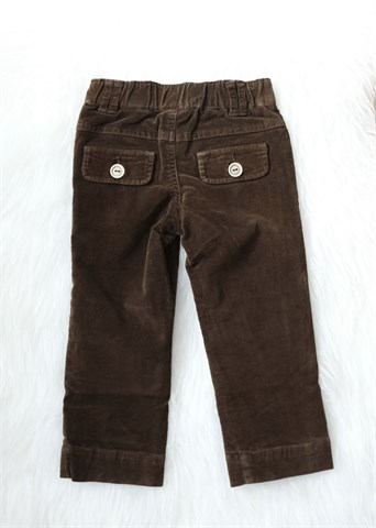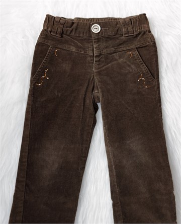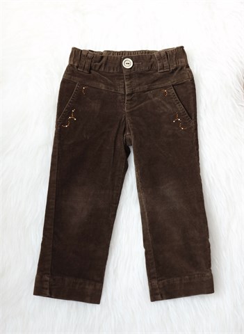 Ele baby hlače od samta smeđe boje, podstavljene pamučnom podstavom. Prednji gumbić, pasica za remen. Prednji bočni džepovi (ukrašeni aplikacijama), stražnji ukrasni/lažni džepovi. Stražnja strana pasice je rastezljiva pa je širina prilagodljiva (vidjeti mjere). Mekane i rastezljive.