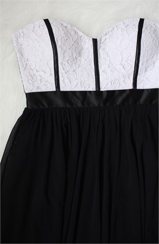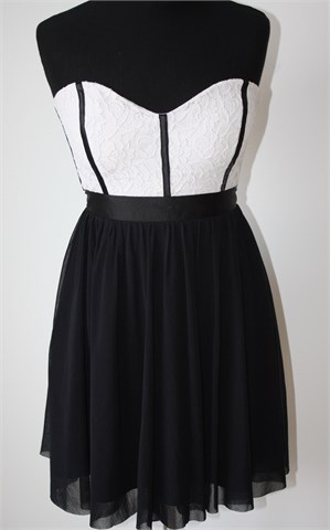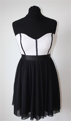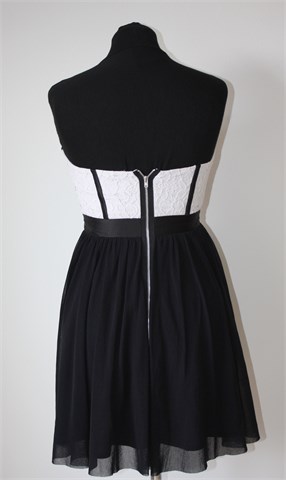 Elise Ryan haljina bez naramenica, gornji dio imitacija čipke bijele boje (sa prednje strane spužvasto podstavljeno), donji dio mrežasti til crne boje. Satenska pasica i crni prugasti dijelovi na gornjem dijelu (u njih su ušivene plastične žice). Stražnji cif, podstavljena.