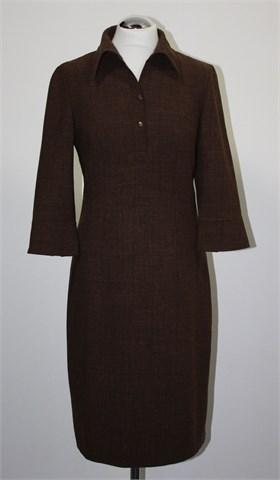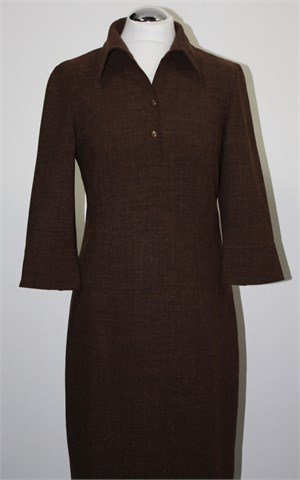 Ella Vivaldi (Labod) haljina od tanjeg štofastog materijala, prošarano smeđe boje. Rukavi su poludugi i na krajevima imaju male rasporke. Prednje kopčanje sa drukerima, podstavljena - osim rukava (par sitnijih oštećenja na podstavi). Prednji i stražnji ušitci (strukirana), bočni cif. Blago rastezljiva.