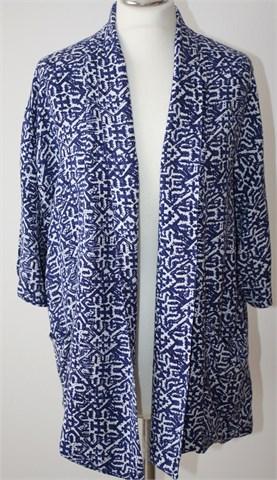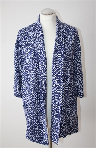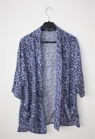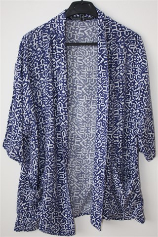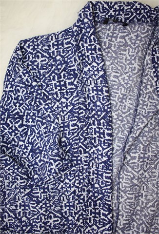 Ellos blazer kimono stila sa kratkim rukavima i uzorkom u kombinaciji plave, bijele i crne boje. Bez kopčanja, prednji džepovi. Tanji i lagan, nije rastezljiv.