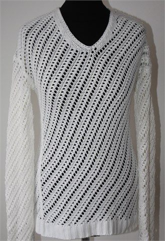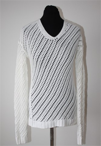 Ellos rupičasta pletena vesta sa dugim rukavima, bijele boje. Pletivo srednje debljine, rastezljivo.