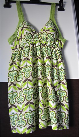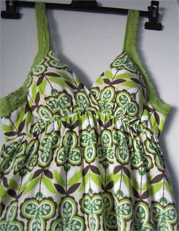 Energie topić sa zelenim čipkastim naramenicama, podloga je bež boje sa retro printom u zelenoj, smeđoj i bijeloj boji. Gornji dio je podstavljen sa fiksnim umetcima pa se ne mora nositi grudnjak. Ispod grudi i na leđima su zašivene gumice pa je taj dio dosta rastezljiv i prilagodljiv. Jako ugodan, lagan i mekan materijal.