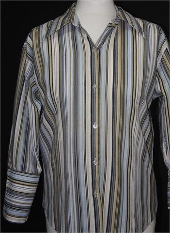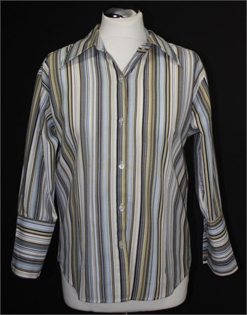 Engino košulja sa poludugim rukavima, bijele boje sa prugama u raznim bojama (svijetlo i tamno plava, bež). Prednje kopčanje, prednji ušitci (blago strukirana). Lagan materijal, nije rastezljiv.