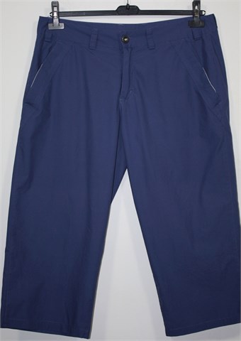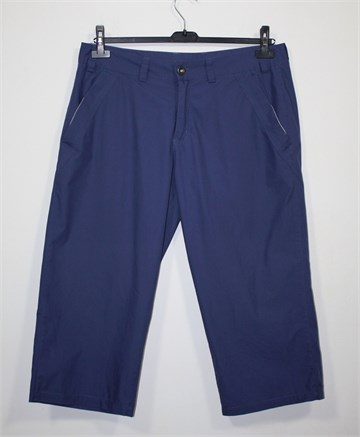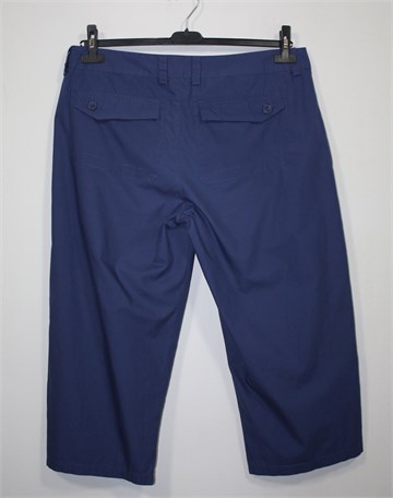 Equipe poluduge hlače plave boje. Prednji cif i kopčanje, pasica za remen. Prednji bočni, stražnji džepovi sa preklopom i gumbom. Tanji i nerastezljiv pamuk.