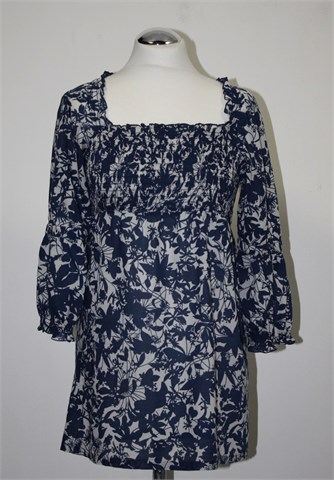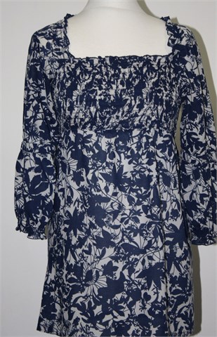 Esprit bluza/tunika sa poludugim rukavima, plavo-bijele boje sa printom. Na prsima i leđima prošivena gumicama pa je širina dosta prilagodljiva (sa stražnje bočne strane jedna gumica se malo odšila ali nije jako primjetno i ne smeta kod nošenja). Tanji i lagan, prozračan pamuk.