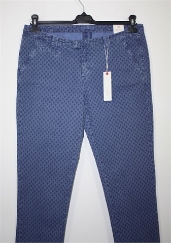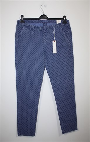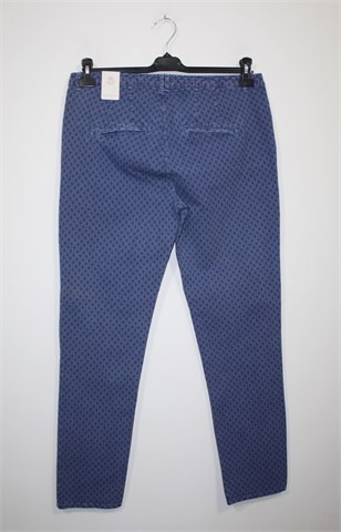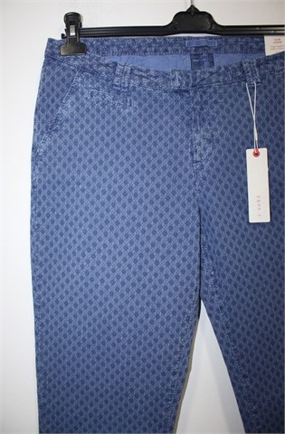 Esprit slim chino hlače plave boje s uzorkom (kao na slikama). Prednji cif i kopčanje, uska pasica za remen. Prednji bočni, stražnji ukrasni džepovi. Tanje i rastezljive, materijal je blago reljefni. Šire u gornjem dijelu, uže u nogavicama (vidjeti mjere).