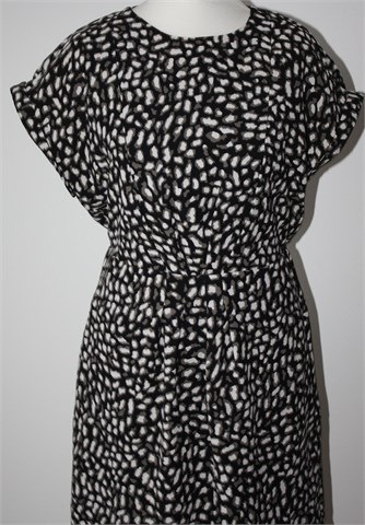 Esprit haljina sa kratkim rukavima, crne boje sa printom (boje i uzorak printa vidljivi na slikama). Prošivi na sredini haljine, sa stražnje strane u struku ušivena gumica (prilagodljiva širina). Bočni džepovi, podstavljena. Duža sa stražnje strane (vidjeti mjere).