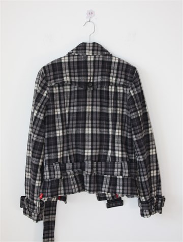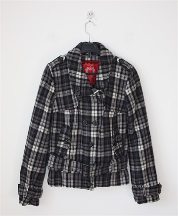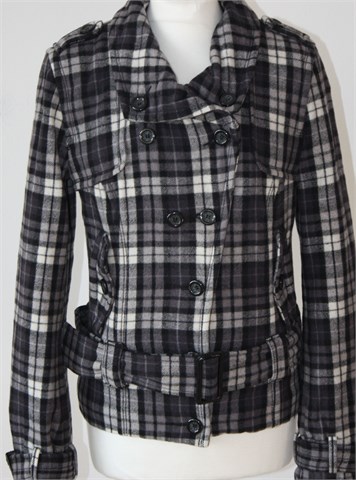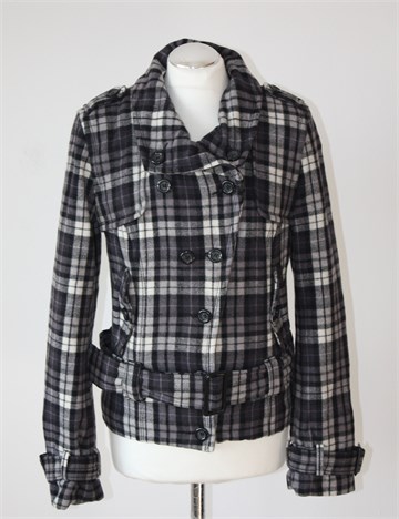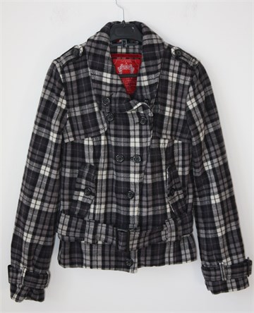 Esprit kraći kaput (jakna), kombinacija crne, sive i bijele boje (uzorak vidljiv na slikama). Prednje kopčanje, bočni džepovi sa preklopom i gumbom. Pasica za remen sa pripadajućim remenom od istog materijala. Podstavljen.