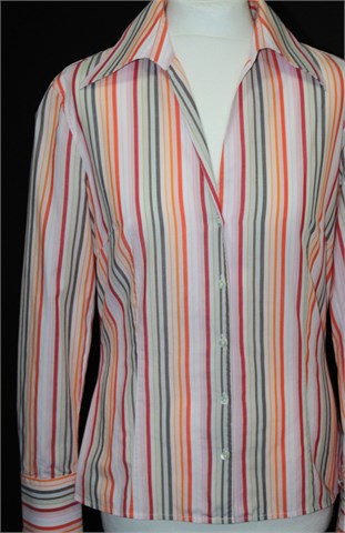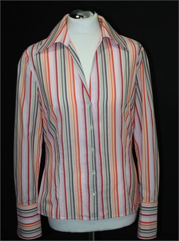 Esprit košulja sa dugim rukavima, bijele boje sa šarenim prugama (boje vidljive na slikama). Prednje kopčanje, prednji i stražnji ušitci. Čvrst i nerastezljiv pamuk.