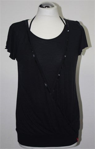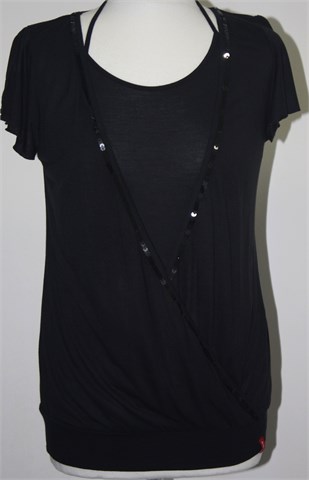Esprit majica sa kratkim rukavima crne boje, ukrasne šljokice našivene uz rub prednjeg otvora. Prorezi na rukavima, dvoslojnog izgleda - "unutarnji" topić se veže oko vrata. Stegnuta pasicom na dnu. Mekan i rastezljiv materijal.