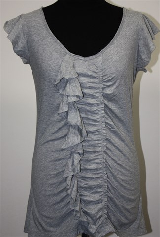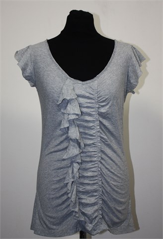 Esprit majica sa malim kratkim rukavićima (više kao prekopi preko remena), sive boje sa sitnim srebrnim česticama na materijalu pa je blago šljokava. Sa prednje strane volančić i nabori. Tanja i lagana, rastezljiva.