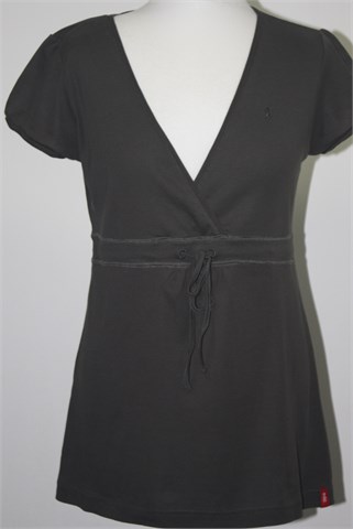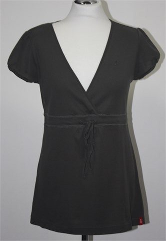Esprit majica sa kratkim rukavima, tamno sive boje. Prednji dio djeluje kao da je na preklop (fiksno), ispod grudi vizualno rezana i ima špagicu za vezanje. Kvalitetan i mekan pamuk, blago rastezljiv.