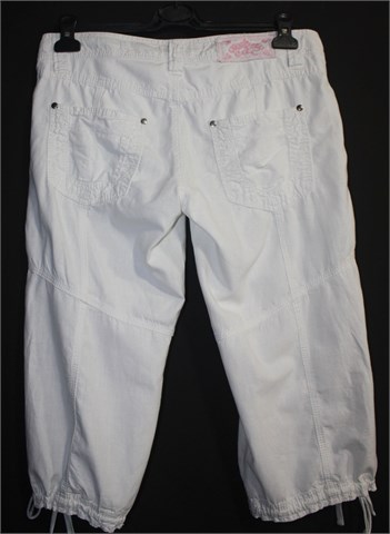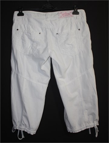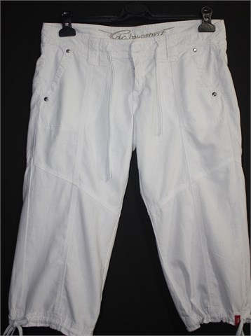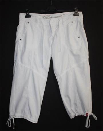 Esprit poluduge hlače bijele boje, odlična kombinacija lana i pamuka. Prednji cif i kopčanje, pasica za remen sa uvedenom špagicom/remenčićem. Prednji bočni, stražnji klasični džepovi. Vezice za stezanje na krajevima nogavica. Mekan ali čvrst materijal.