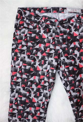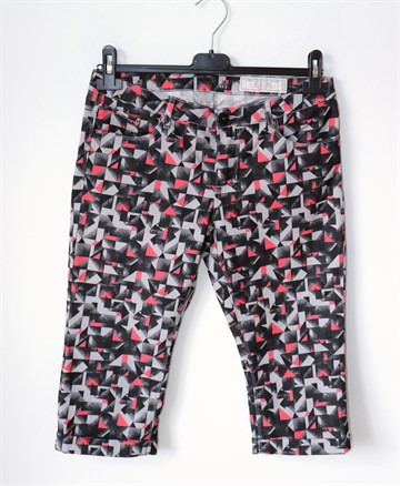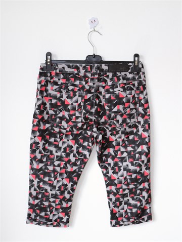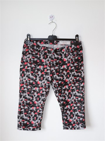 EDC Esprit poluduge hlače sa printom (boje i uzorak vidljivi na slikama). Materijal je kao tanji traper, rastezljive. Prednji cif i kopčanje, pasica za remen. Prednji i stražnji džepovi.