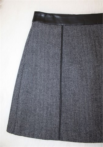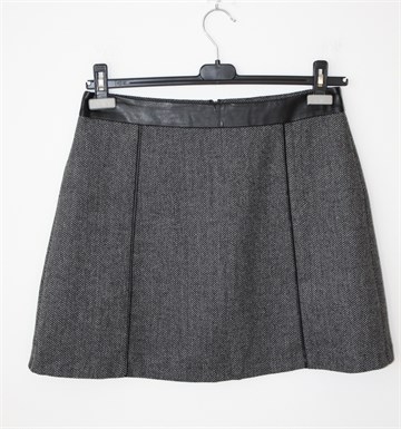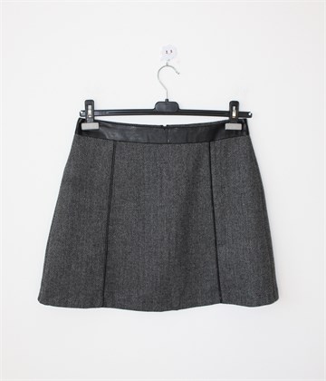 Esprit suknja crno-sive boje sa uzorkom na materijalu (vidljivo na slikama). Pasica i ukrasne trake sa prednje strane od umjetne kože/skaja crne boje. Stražnji cif, podstavljena.