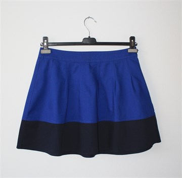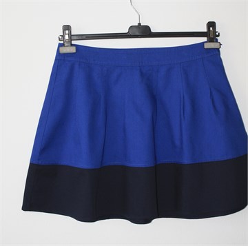 Esprit suknja u dvije nijanse plave boje (tamno plava i kraljevsko plava boja). Bočni cif i gumbić, tanji i lagan pamuk. Ukrasni ušitci sa obje strane, nije rastezljiva. Nešto duža sa stražnje strane (vidjeti mjere).