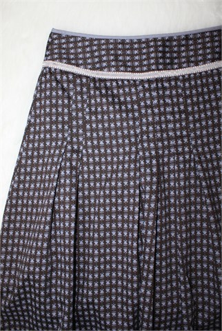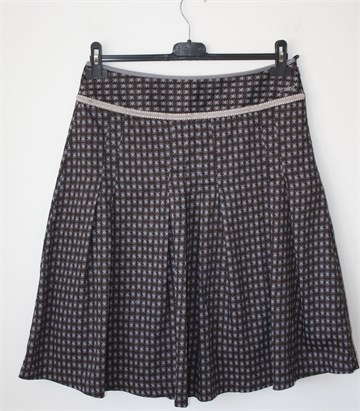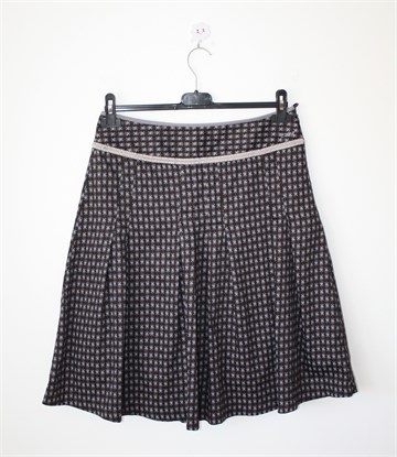 Esprit suknja tamno smeđe boje sa sivim printom (boje i uzorak printa vidljivi na slikama). Ukrasne trakice na pasici, bočni cif i kopčanje (gumbić se odšio ali može se zašiti bilo kakav mali gumb). Podstavljena, tanka i lagana.