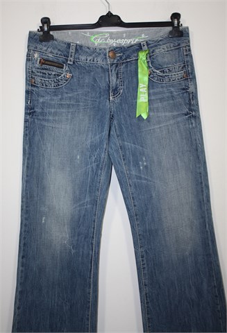 Esprit traper hlače svijetlo plave boje, ispranog i iscufanog izgleda (tvornički used look - djeluju nošeno). Prednji cif i kopčanje, pasica za remen. Prednji i stražnji džepovi. Šire nogavice, laganiji traper (nisu skroz tanke) - model Play. Plići model (vidjeti mjere).