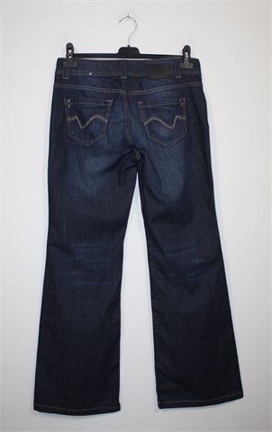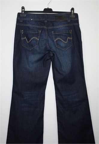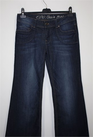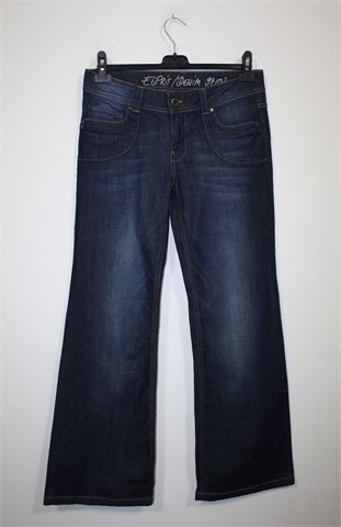 Esprit traper hlače tamno plave boje, mjestimično ispranog izgleda (tvornički used look). Prednji cif i kopčanje, pasica za remen. Prednji i stražnji džepovi (stražnji ukrašeni aplikacijama od konca). Široke nogavice (vidjeti mjere), blago rastezljive.