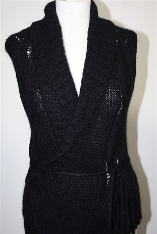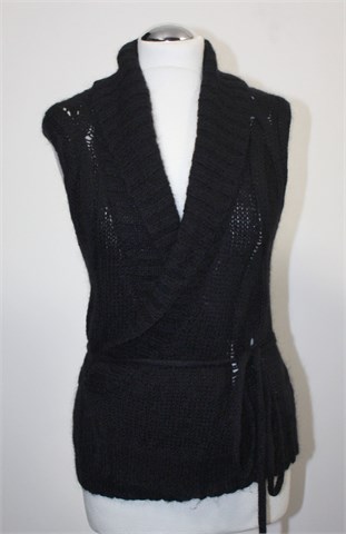 Esprit vesta bez rukava, crne boje sa uzorkom pletenica u pletivu. Sa prednje strane preklop, vezanje sa vezicama. Mekano, mucasto pletivo - srednje debljine. Rastezljiva.