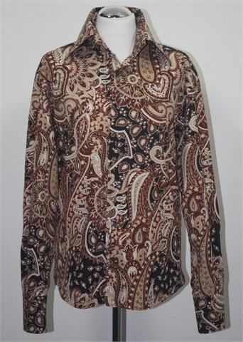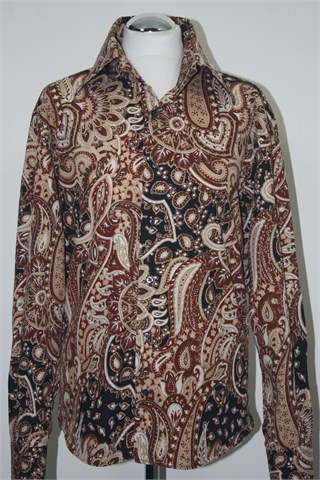 Estebe košulja sa dugim rukavima, šareni print - pretežno u smeđim tonovima. Prednje kopčanje, stražnji ušitci. Nije rastezljiva. Kopčanje je sa muške strane ali mi je nekako više ženski model (može biti unisex).