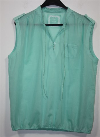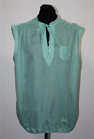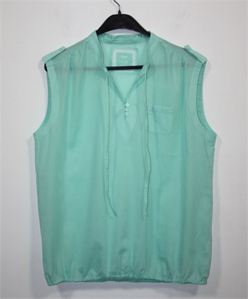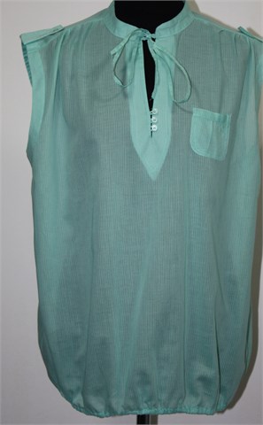 Etam bluza bez rukava, mint zelene boje sa diskretnim prugama. Prednji otvor i gumbići, mali džepić na prsima. Stegnuta gumicom u pasici. Lagan i prozračan pamuk, blago providan.