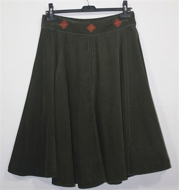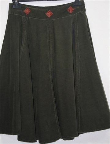 Etam suknja od tanjeg i mekanog samta, maslinasto zelene boje. Bočni cif, izvezene aplikacije od konca na pasici.