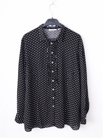 Eterna košulja sa dugim rukavima, crne boje sa bijelim točkicama. Prednje kopčanje sa gumbima (do cca pola dužine kopčanja ukrasni volančić sa svake strane), prednji ušitci. Mekan i lagan materijal, nije rastezljiv.