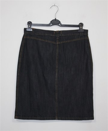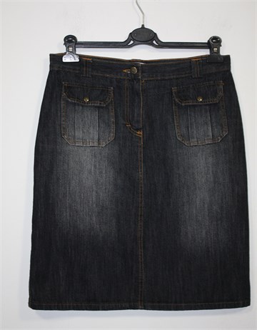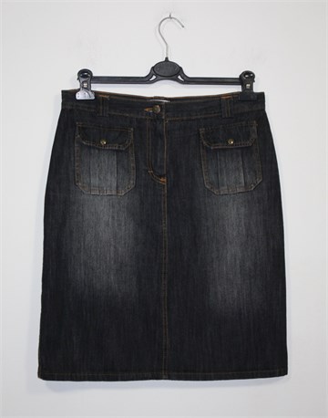 Euronova traper suknja tamnije sive boje, mjestimično ispranog izgleda (tvornički used look). Prednji cif i kopčanje (malo oštećenje na otvoru za gumb ali ne smeta kod nošenja), uska pasica za remen. Prednji džepovi sa preklopom i drukerom. Nije rastezljiva.