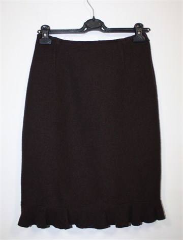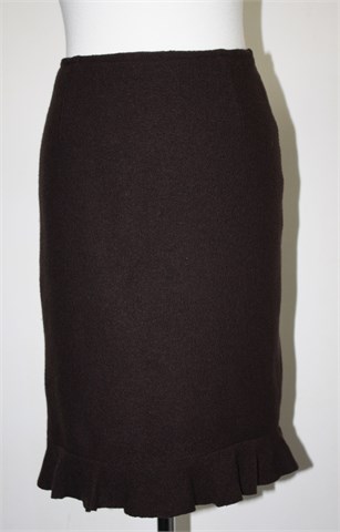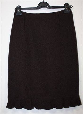 Eva Tralala (Paris) suknja od toplog i mekanog tvida, tamno smeđe boje. Na dnu mali volanćić, bočni cif. Podstavljena (na podstavi par sitnih oštećenja), blago rastezljiva.