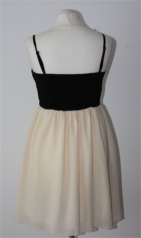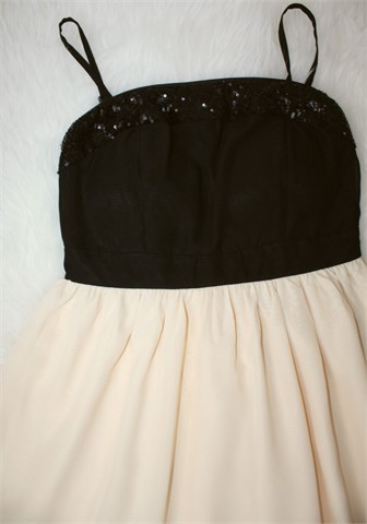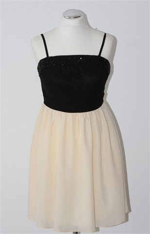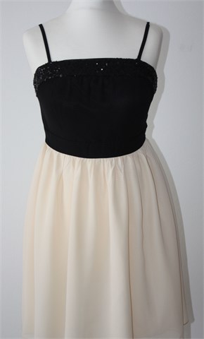 Even&Odd haljina bez rukava (podesive naramenice) u kombinaciji nude (donji dio) i crne boje (gornji dio). Gornji dio ukrašen sitnim okruglim crnim šljokicama, podstavljen u dijelu grudi (jastučići), našivena silikonska traka s unutarnje strane. Sa stražnje strane ušivene gumice pa je širina prilagodljiva (vidjeti mjere). Podstavljena, bočni cif.