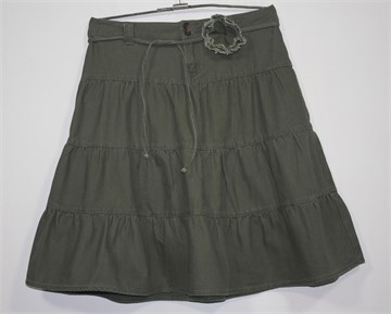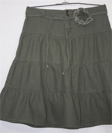 Evona pamučna suknja isprane maslinasto zelene boje. Prednji cif i kopčanje, pasica za remen (pripadajući tanki remen sa ukrasnim cvjetićem). Čvrst i debeli pamuk, diskretni uzorak na tkanini.