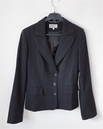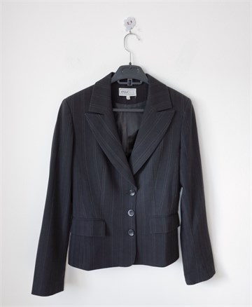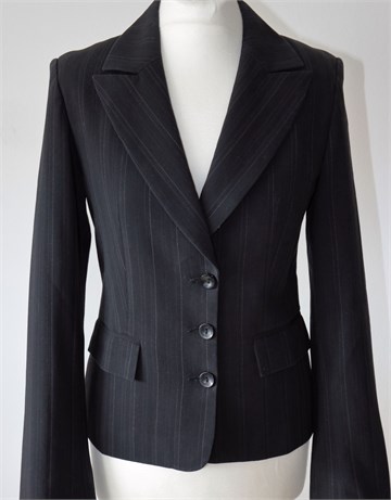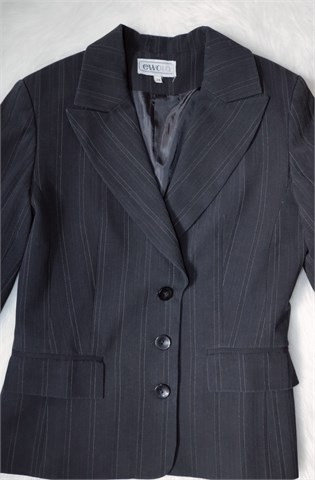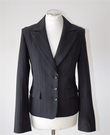 Ewola sako crne boje sa sivim prugama. Prednje kopčanje, bočni džepovi sa preklopom. Jastučići u ramenima, podstavljen.