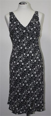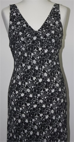 Express haljina bez rukava, crno-bijele boje sa cvjetnim uzorkom. Podstavljena u gornjem dijelu, između prsiju vezice za ukrasno vezanje. Bočni cif, na dnu haljine mali volančić. Lagan i lepršav materijal (blago rastezljiv, odlično se prilagođava tijelu).