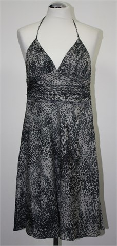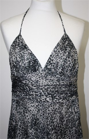 Express prekrasna svilena haljina, sive boje s uzorkom (kao na slici). Vezanje oko vrata, leđa su otvorena. Bočni cif, podstavljena. Lagana i lepršava svila, prekrasna :)