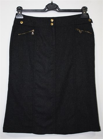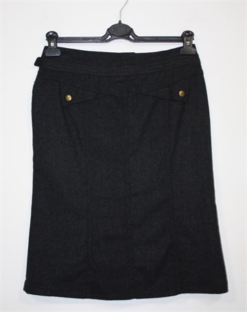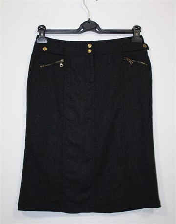 Express suknja od tanjeg vunastog materijala, prošarano tamno sive boje. Prednji cif i kopčanje, mali prednji džepovi sa cifovima - stražnji ukrasni džepovi sa preklopom. Blago rastezljiva.