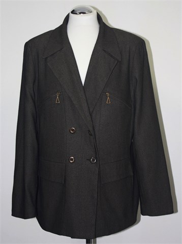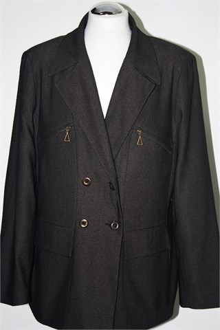 Exqui sako crno-smeđe boje s uzorkom na materijalu (vidljivo na slikama). Prednje kopčanje, bočni džepovi sa preklopom (još uvijek zašiveni) i ukrasni džepovi sa cifom na prsima. Jastučići u ramenima, podstavljen. Blago rastezljiv.