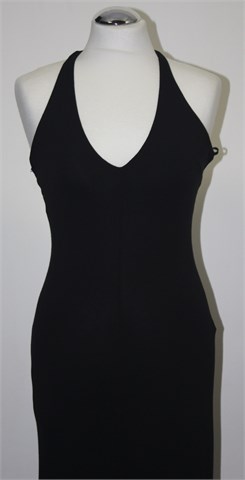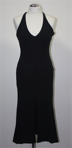 Extyn haljina crne boje sa vezanjem oko vrata, leđa su otvorena. Sa prednje strane duži otvor. Mekan i rastezljiv materijal.