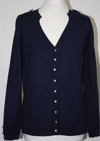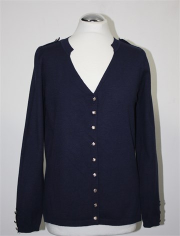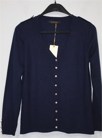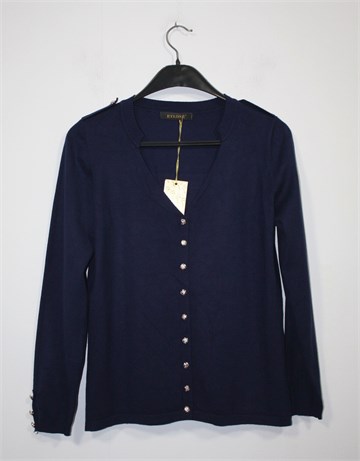 Eylone vesta/kardigan tamno plave boje. Prednje kopčanje, svi gumbi su ukrasni i zlaćane boje. Tanja, mekana i rastezljiva.