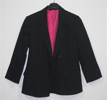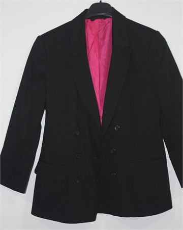 F&F sako/blazer crne boje, podstava je boje ciklame. Prednje kopčanje, dva lažna prednja džepa. Poludugi rukavi, u ramenima blagi jastučići. Vrlo praktičan komad odjeće, može se nositi cijele godine.