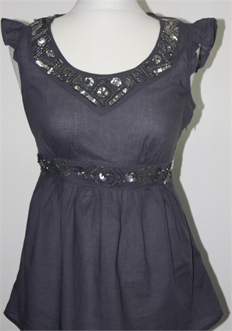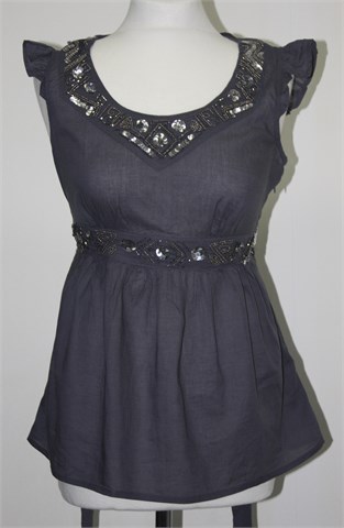 F&F bluza sa malim rukavićima, lijepe tamnije sive boje. Našivene perlice sa prednje strane, na dekolteu i u pasici koja dođe ispod prsiju. Bočno našivene trake za vezanje, bočni cif. Lagana i prozračna.