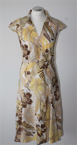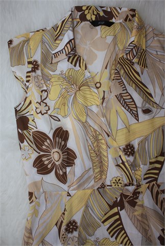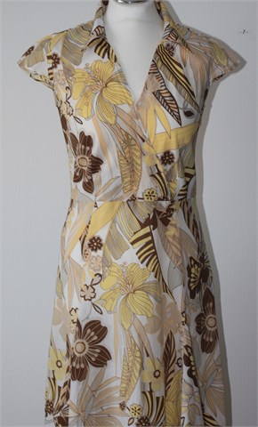F&F haljina sa kratkim rukavima, bijele boje sa šarenim cvjetnim printom (boje i uzorak printa kao na slikama). Prednji fiksni preklop (zašiven), rezana u struku i prema dolje se širi. Vrlo tanak i lagan pamuk, nije rastezljiv. Bočni cif.
