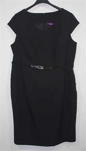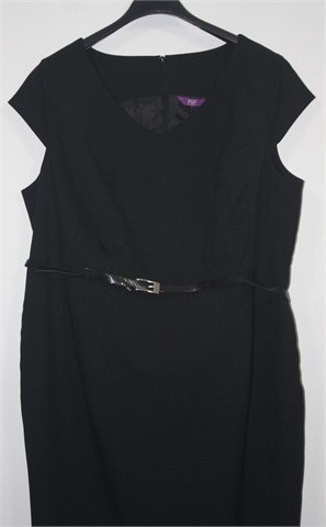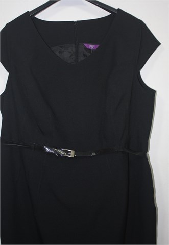 F&F shift haljina crne boje sa kratkim rukavima. Prednji i stražnji ušitci (blago strukirana) i prekrasno prati liniju tijela. U struku rezana, ima pasicu za remen i pripadajući tanki remenčić (lakirana imitacija zmijske kože). Stražnji dugački cif, podstavljena cijelom dužinom.