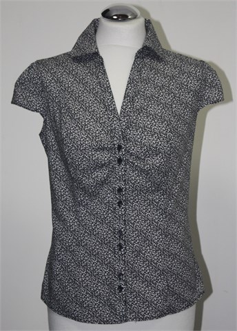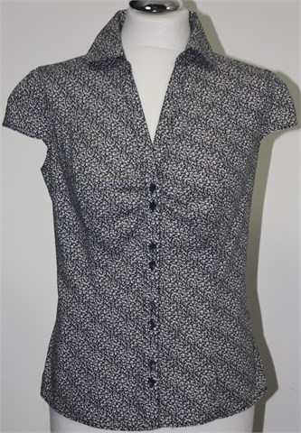 F&F košulja sa kratkim rukavima, crne boje sa sitnim bijelim cvjetnim printom. Klasično prednje kopčanje, blago nabrana kod grudi. Prednji i stražnji ušitci, strukirana. Blago rastezljiv materijal.
