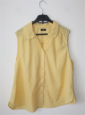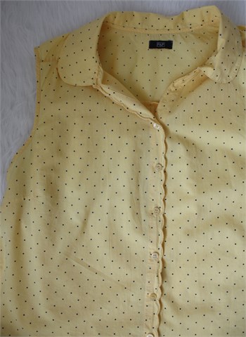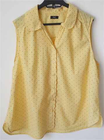 F&F košulja bez rukava, žute boje sa tamno plavim točkicama. Prednje kopčanje, mali bočni prorezi. Tanja i lagana, nije rastezljiva.