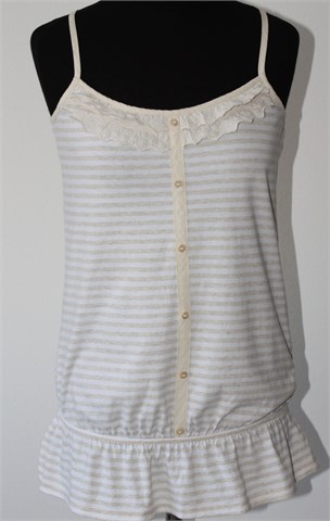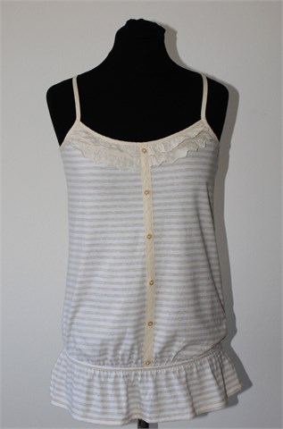 F&F topić/majica bez rukava, prugasta kombinacija bijele i prošarano bež boje. Sa prednje strane ukrasni gumbići i volančići oko dekoltea. Pri dnu stegnuta gumicom. Mekana i rastezljiva.