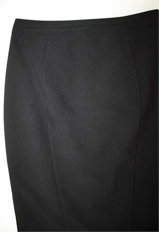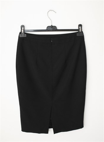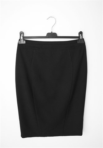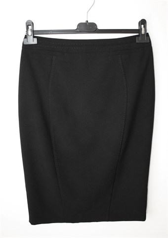 F&F suknja crne boje, klasičnog pencil kroja. Stražnji cif i mali rasporak, podstavljena. Na pasici i sa prednje strane ukrasni prošivi od crnog konca. Nije rastezljiva.