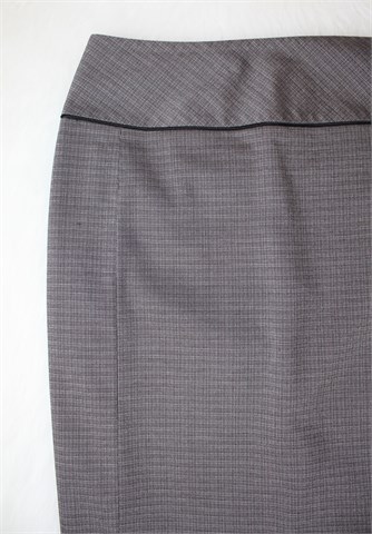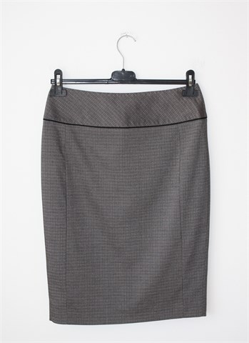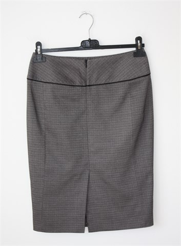 F&F suknja crno-bijele boje (djeluje sivo i blago sjajno) sa sitnim prugastim uzorkom na materijalu. Stražnji cif, podstavljena (podstava je oštećena ali ne smeta kod nošenja). Blago rastezljiva, stražnji rasporak.