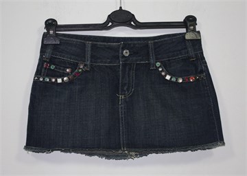 Fox kratka suknja od tamnijeg trapera, rubovi suknje su tvornički iscufani (suknja je porubljena). Prednji cif i kopčanje, pasica za remen. Prednji i stražnji džepovi - ukrašeni gumbima i aplikacijama (vidljivo na slikama). Used look.