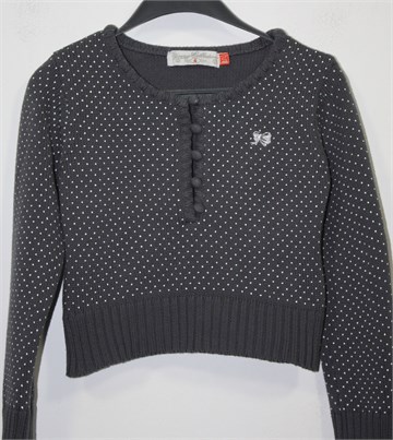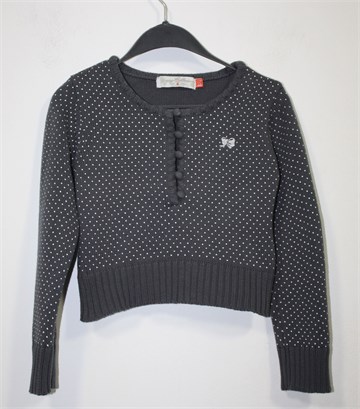 FOX vesta tamno sive boje sa bijelim točkicama. Sa prednje strane gumbići i mala aplikacija srebrne mašnice (od konca). Ugodno končano pletivo, rastezljivo.